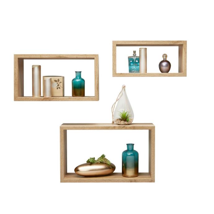 Pričarajte si udobje tudi v vaš dom s tem praktičnim in igrivim setom stenskih polic. Set vsebuje tri posamezne police, dimenzij prib. 45/27/16 cm, 40/22/16 cm in 35/17/16 cm. Stenske police imitacije divjegaa hrasta so prevlečene s folijo, ter preproste za čiščenje in vzdrževanje. Primerne so za slike, knjige, svečke ali dekor, katere boste s tem setom zagotovo postavili v središče pozornosti.