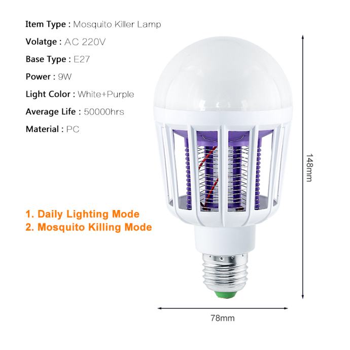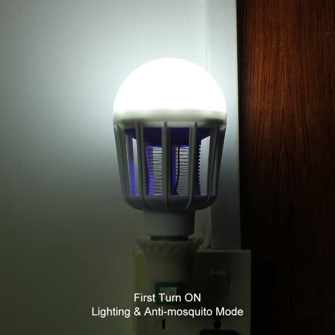 Led žarnica+ uničevalec komarjev, dve napravi v eni. Služila bo dvojnemu namenu, kot normala žarnica, ki bo razsvetlila prostor ali kot uničevalec komarjev, mrčesa, muh, žuželk. Privijete jo v grlo stropne, stenske ali zunanje svetilke in tako bo služila dvojnemu namenu. Nadomestila bo navadno žarnico in hkrati poskrbela da vas ne bodo obkrožali komarji in mrčes. Po želji lahko vklopite žarnico z uničevalcem komarjev ali vklopite le uničevalec komarjev brez svetlobe. Primerna za notranjo in zunanjo uporabo, vendar mora biti zunaj montirana tako, da ne pride v stik z dežjem. Priložena podrobna slovenska navodila, garancija.