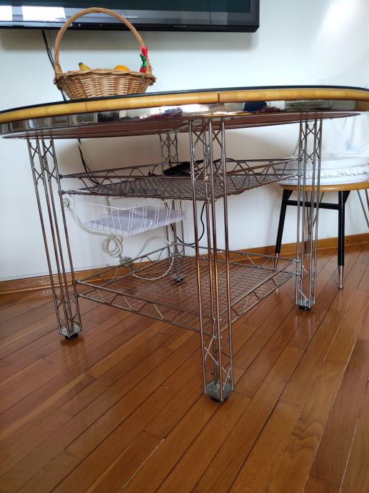 Okrogla lesena miza 115 cm s kromiranim nastavkom. Komplet z 4 stoli. Lesena plosca ima zascitno steklo 5 mm. Lep dizajn primerno tudi za lokal. Komplet 400 Eur. Moznost nakupa Samo mize za 200 Eur.