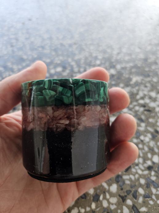 Prodam orgonit valj, Izredno močen zaradi posebne mešanice ki sem jo razvil. Ima pa v sebi rožni kvarc, malahit in pa slovenski kvarc ki ga nabiram izključno za izdelavo orgonitov. Dimenzije: višina= 5,5cm, premer=6cm in teža 350g.