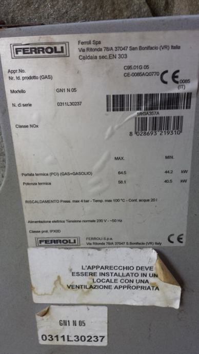Prodajem peć Ferroli 58,1Kw za centralno grijanje na pelete,lož ulje ili plin u super stanju.
