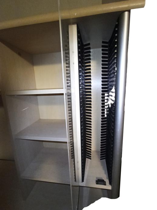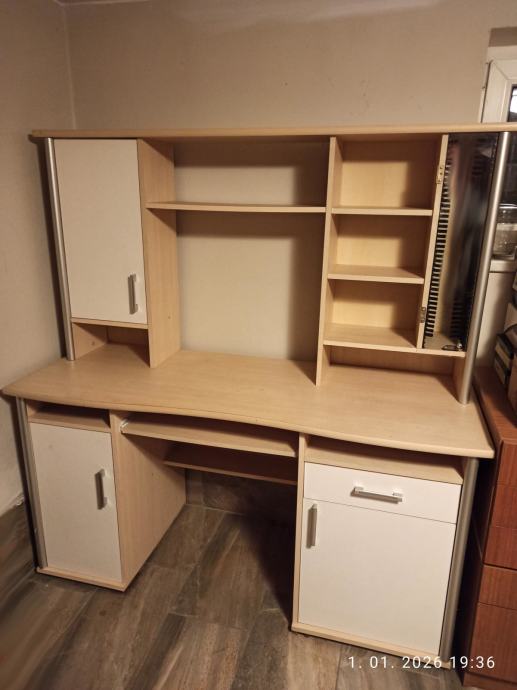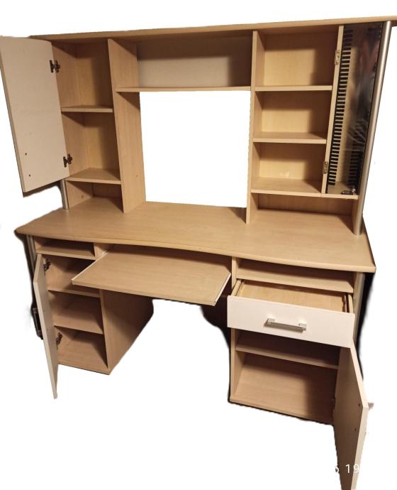 Mere širina 156 cm, globina 60 cm, višina 162 cm. Izvlečljiv del za tipkovnico. CD knjižnica.