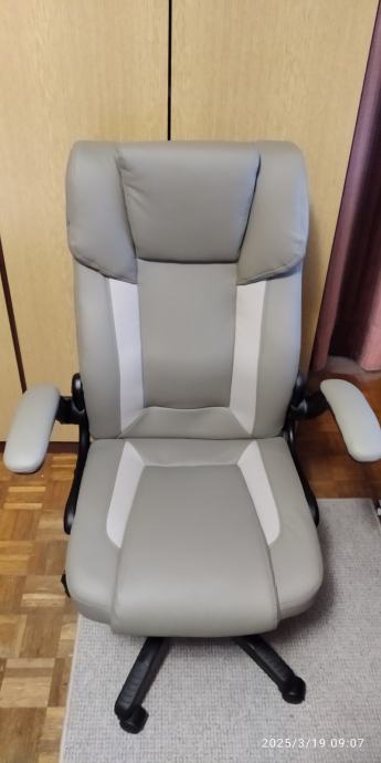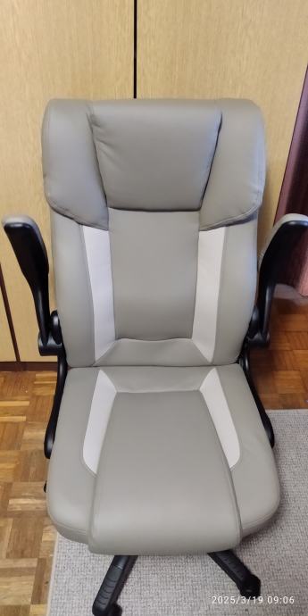 Pisarniški stol vrtljivi, nastavljiva višina, ročaji se lahko dvignejo. Material umetno usnje.Razlog prodaje mi ne odgovarja barva imam vse v črnem stilu