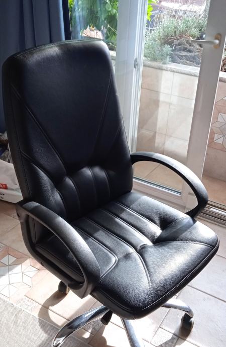 Pisarniški stol, črne barve s kovinskim podnožjem na kolescih, popolnoma ohranjen, z gibljivim naslonom, primeren za k pisalni mizi starejšega otroka.
