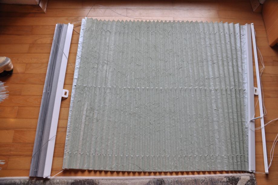 Na tem senčilu sta na vodilih pritrjeni dve senčili. Najprej smo imeli senčilo z zvezdicami (ki ima tudi termo folijo za toplotno izolacijo), ki ima možnost regulacije z obeh strani (z vrha in z dna). Ker ni zatemnilo dovolj, smo na ista vodila dodali še zeleno senčilo, ki je temnejše, tudi to ima toplotno izolacijo). To senčilo pa se regulira z vrha. V bistvu lahko sami izberete, katero senčilo bi želeli uporabljati, ker drugo ostane zloženo na dnu (oz. na vrhu okna) in ne vpliva na drugo senčilo.