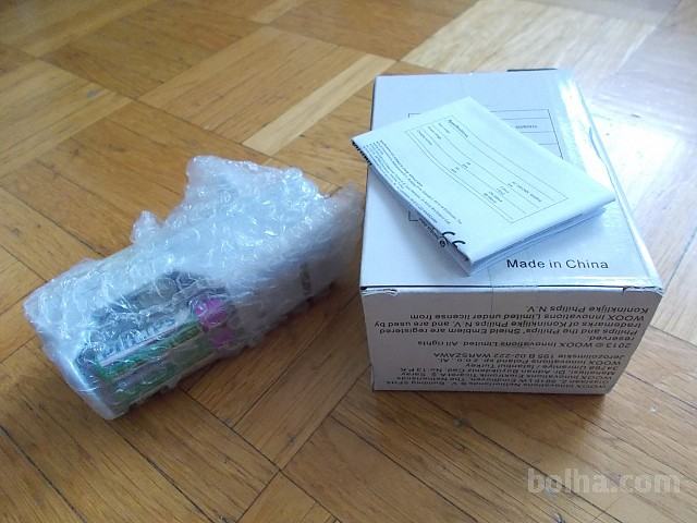 Dobite beli polnilec in 2 originalni AAA bateriji, ki sta rechargable, torej jih večkrat polnite. Polnilec je originalno zapakiran in nerabljen, na slikah pa lahko vidite kako zgleda, ko je razpakiran (ta razpakiran je sicer moj, za potrebe slikanja sem vam samo želel pokazati, kako zgleda, ko je odprta folija).