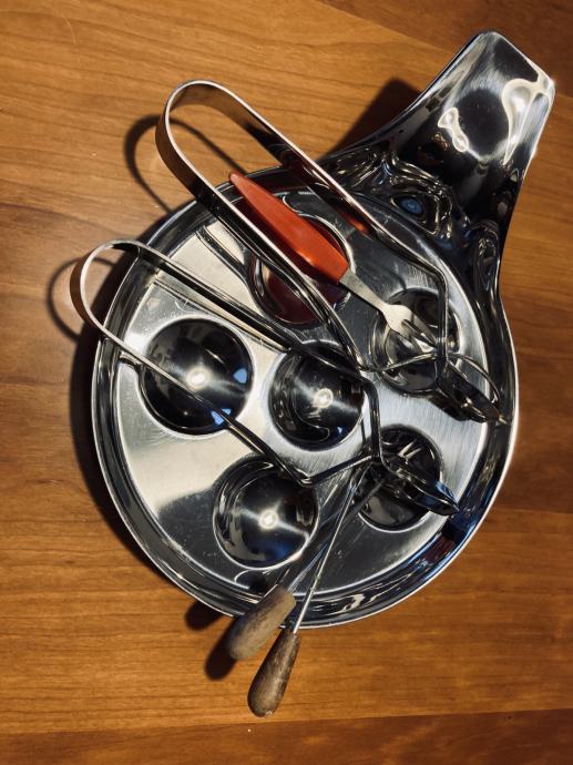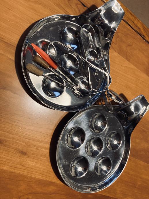 Rostfrei WMF PLADENJ ZA PRIPRAVO POLŽEV V PEČICI.PLADENJ JE PRIMEREN ZA 6 POLŽEV IN SLUŽI TUDI ZA SERVIRANJE JEDI..V KOMPLETU SO ŠTIRJE PLADNJI.DVE PRIJEMALKI ZA POLŽA IN ŠTIRI MAJHNE VILICE.