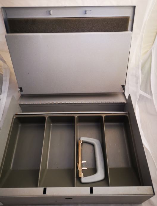 Prenosna ročna kovinska blagajna za denar potrebno je namestiti novo ključavnico drugače pa je močna kompaktna. Za vse ostale info pa na tel. ali SMS 070 589 103