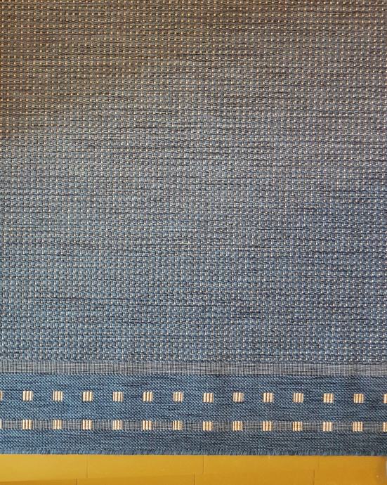 Preproga vrvica, modre barve z bež vzorcem, 2m x 3m, za kuhinjo, nova. Izdelana je iz sintetičnih vrvic, čvrsta, se ne upogiba na robovih in je enostavna za pranje. (Skupaj z njo lahko kupite tudi "pasent" preprogo za hodnik --- poglejte moj drugi oglas).