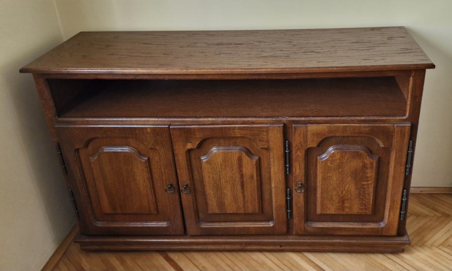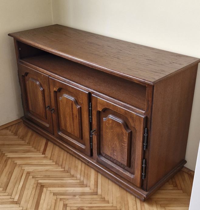 Je trdna, stabilna in brez poškodb – primerna za dnevno sobo, jedilnico, hodnik ali celo kot TV omarica. Les ima topel rjav ton.