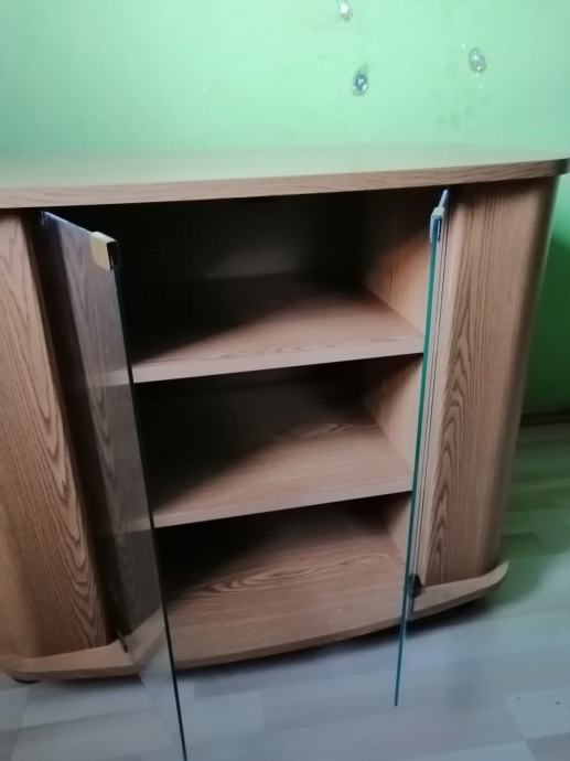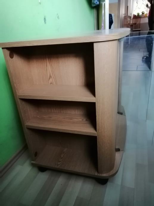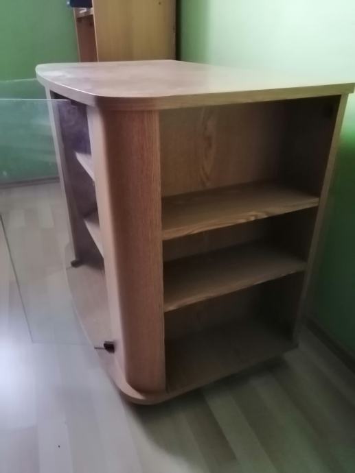 Poroda odlično ohranjen regalček na kolesih zaradi prostorske stiske. Spredaj ima police z steklenimi vrati, ki se ob dotiku same zaklenejo ali odklenejo na obeh straneh ima tudi poličke. Cena 20€
