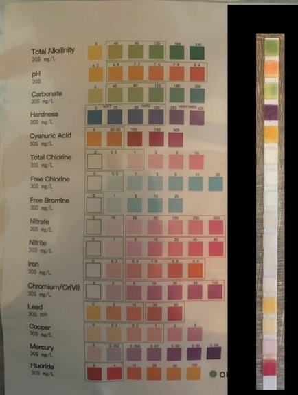 testni trakovi za vodo, ki jih je enostavno prepoznati, 16 parametrov: pH/trdota/cianurična kislina/živo srebro/fluorid/karbonatna korenina/skupna alkalnost/krom/svinec/baker/skupni klor/prosti brom/nitrat/nitrit/železo.