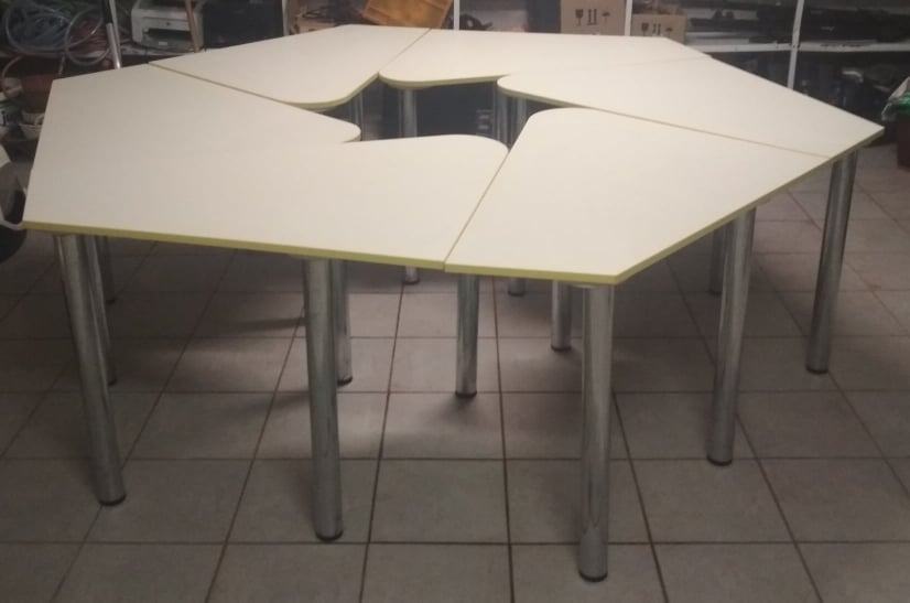 Gre za 6-kotno mizo, ki je sestavljena iz 6 delov na način, da je v osrčju mize prazen prostor v obliki sonca. Miza je idealna za pisarniške oziroma poslovne prostore, lahko tudi za dom. Je super ohranjena.
