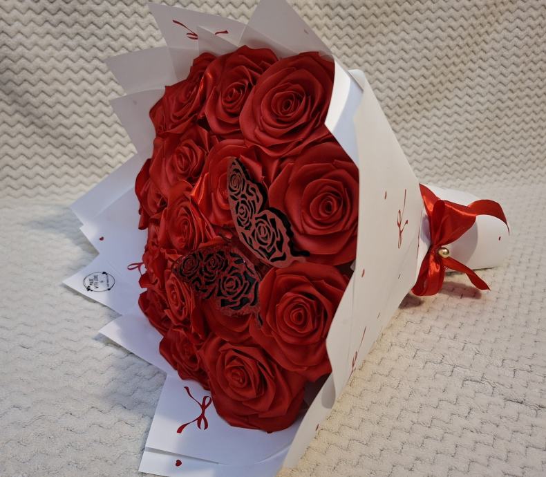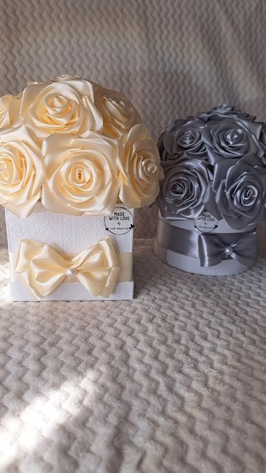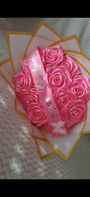Naši šopki iz satenastih trakov so ročno izdelani z veliko potrpežljivosti, natančnosti in ljubezni. Vsaka rožica je unikat, ustvarjena iz nežnega satenastega traku, ki daje šopku eleganten in trajen videz.
