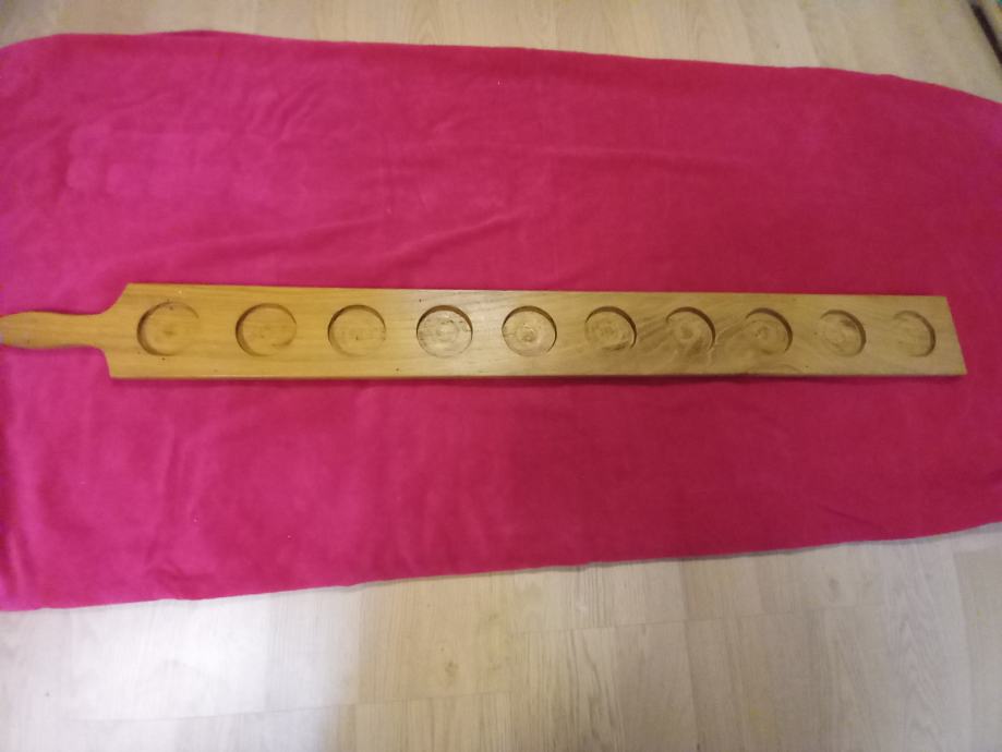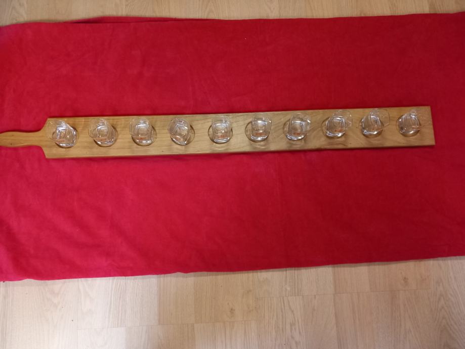 Dolžina lesenega dela 115 cm, širina 10 cm, za 10 kozarčkov špricerja, vina , žganja.....za dobro in veselo družbo, primerno za fantovščino, praznovanja, zabave, roj. dan...... Kozarci se prodajajo ločeno, uporabljeni samo za fotografiranje. Mogoča dostava Ljubljana,Celje ali obala. Tel. 031 679 411