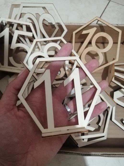 Prodam samostoječe lesene številke za okrasitev (poročnih) miz. Na voljo še od 16 do 22. Cena vsake posebej je 1,2 €.