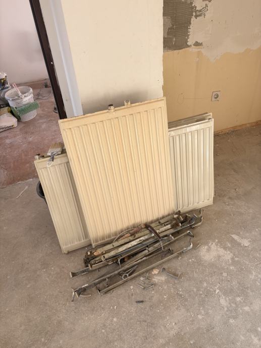 Radiatorji z enocevnim sistemom priklopa, bež barve. Menjali jih bomo zaradi temeljite prenove.