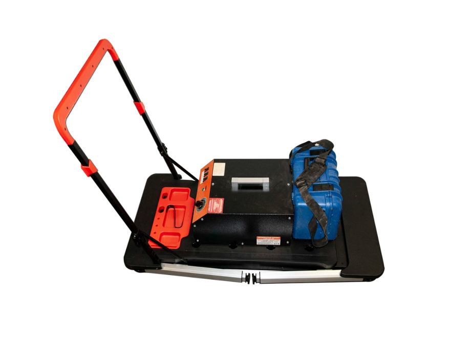 Osnovna funkcija delovne mize močno olajša delo na terenu. Ob strani je oranžna posoda za droben material ali orodje in pripomočke.