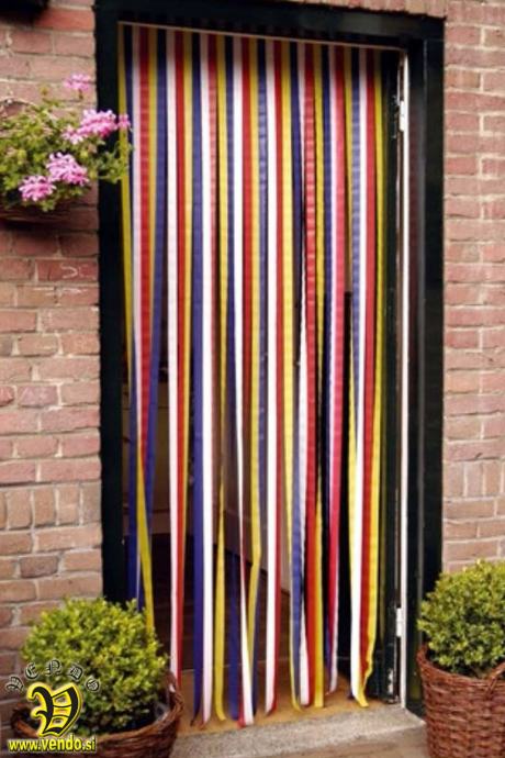 Trpežna zavesa v živih barvah za vrata, balkon, avtodoma, kamp prikolice, predšotora ali vikenda. Narejeno iz trpežnih trakov iz kvalitetnega PVC-ja.