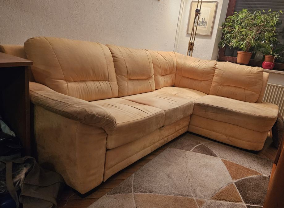 Podarimo sedežno garnituro, s posteljno funkcijo in predalom za posteljnine, dimenzija 240X170, rumene barve.