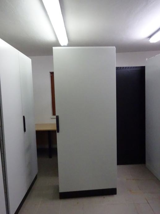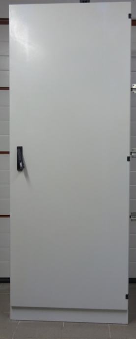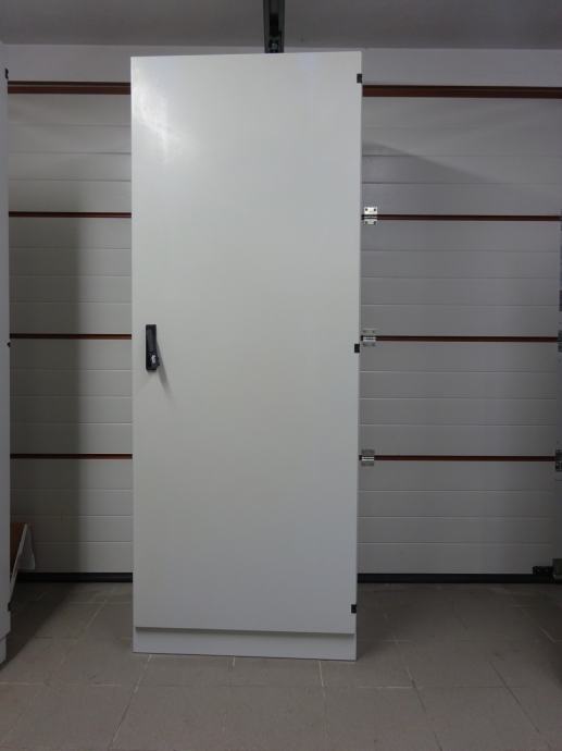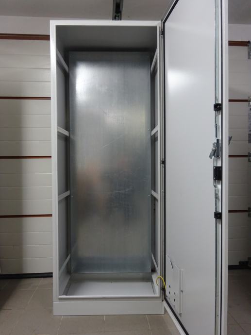 Prosto stoječa kovinska elektro omara z montažno ploščo in podnožjem.
