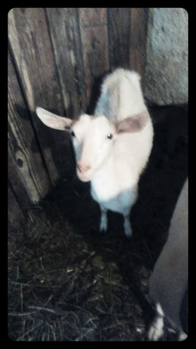 Koza kašmirska, parjena z anglonubijskim kozlom. Te koze so manjše rasti in imajo svilnato dlako, mleka imajo do 2 litra, gojijo jih bolj za meso in volno. Je prijazna in vodljiva, prva kotitev. Brejost ni bila načrtovana, so pa te koze zelo plodne in kotijo 2x letno. običajno po 2 kozlička. Mladič star 4 dni.