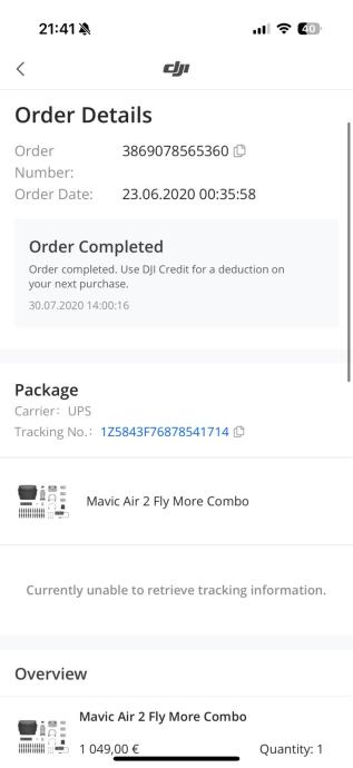 Dron je bil kupljen na uradni strani 23.6.2020, vendar bil zelo malo uporabljen (48km).
