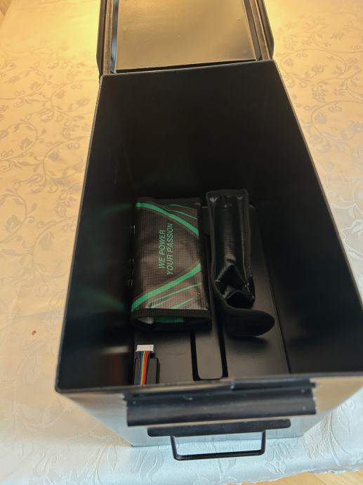 Prodajam zaboj za municijo za shranjevanje LiPo akumulatorjev. S tem ko imamo LiPo in ostale akumulatoje v zaboju za municijo zmanjšamo vrjetnost požara na minimum.