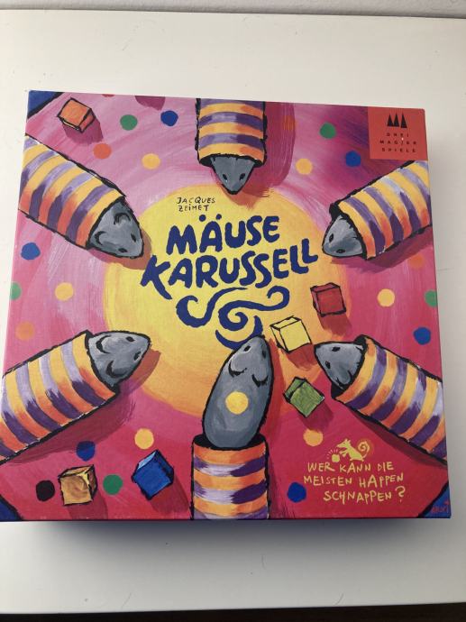 Družabna igra kakovostnega nemškega izdelovalca igrač Drei Magier Spiele. Za 2-6 igralcev, c. 15 min, od 4 do 99 let. Lesene figure mišk in sirnih koščkov, s priloženimi navodili v več jezikih. Cilj: zmaga tisti, ki pridobi najvač koščkov sira. Začne najmlajši otrok, z zaprtimi očmi izbere tri kockice iz črne vrečke in jih položi na vrtiljak. V rovih so skrite miške različnih barv ... Tudi različica igre za starejše otroke.