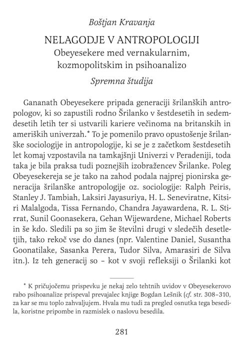 Gananath Obeyesekere (r. 1930) je šrilanški antropolog in zaslužni profesor na univerzi Princeton. Njegovo najvplivnejše delo so Meduzini lasje (1981), natančna in pionirska etnografija o dinamiki simbolne produkcije in inovativnih verskih praksah. Ta študija izvora in pomena simbola vozlastih las – neobveznega, a pogostega znamenja ekstatikinj in ekstatikov – na izviren način presega ostro razlikovanje med osebnimi in kulturnimi simboli; umešča se med dela o subjektivaciji kulture in antropologiji verovanja, ki temeljijo na na osebo osredotočeni etnografiji. S študijem oseb, ki na svetem območju šrilanškega kraja Kataragame izražajo predanost bogovom ne le z vozlastimi lasmi, temveč tudi s hojo po žerjavici, obešanjem na kavlje, transom, prebadanjem jezika ipd., je avtor pokazal, kako gre antropologija osebne izkušnje z roko v roki s psihoanalitično teorijo. Meduzini lasje so v antropologiji in širše obveljali za pomembno delo, utemeljeno na izvirni etnografiji in interpretaciji verskih doživetij s Freudovo psihoanalizo, ki je cepljena na Webrovo razumevanje kulture. Razpravlja o temah, kot so simbolična organizacija krivde, pomen obsedenosti z duhovi in demoni, procesi integracije osebnosti in kulture, vzajemnost med nezavedno motivacijo in kolektivnimi simboli. Avtor s predstavitvijo posameznih mitov in pripadajoče jim ikonografije pokaže, kako se kolektivni simboli ponotranjijo in transformirajo na individualni ravni. Meduzine lase je mogoče primerjati in brati vzporedno s sodobnimi filozofskimi pogledi na ontološki obrat v antropologiji.