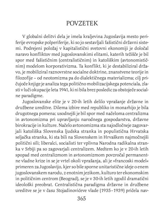 V globalni delitvi dela je imela kraljevina Jugoslavija mesto periferije evropske polperiferije, ki so jo sestavljali fašistični državni sistemi. Podrejeni položaj v kapitalistični svetovni ekonomiji je določal naravo konfliktov med jugoslovanskimi elitami, katerih težišče je bil spor med fašističnim (centralističnim) in katoliškim (avtonomističnim) modelom korporativizma. Ta konflikt, ki je destabiliziral državo, je mobiliziral raznovrstne socialne doktrine, znanstvene teorije in filozofije – od neotomizma pa do dialektičnega materializma; cilj pričujoče knjige je analiza tega politično mobilizacijskega potenciala, zlasti v luči okupacije leta 1941, ki ni bila brez posledic za obstoječe socialne paradigme.