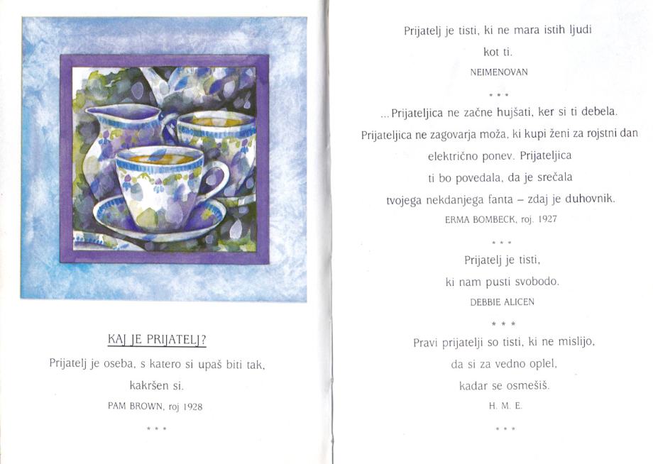 Ta drobna zbirka je mišljena kot majhna pozornost, kadar razglednica ali celo drago darilo ni najboljši način, da bi izrazili zahvalo. da smo lahko prijatelj te redke osebe — najljubšega prijatelja. Dlje bo trajalo kot še tak šopek rož, manj je redilno kot bonboniera, več bo povedalo kot razglednica in se bo ohranilo še dolgo v prihodnosti.