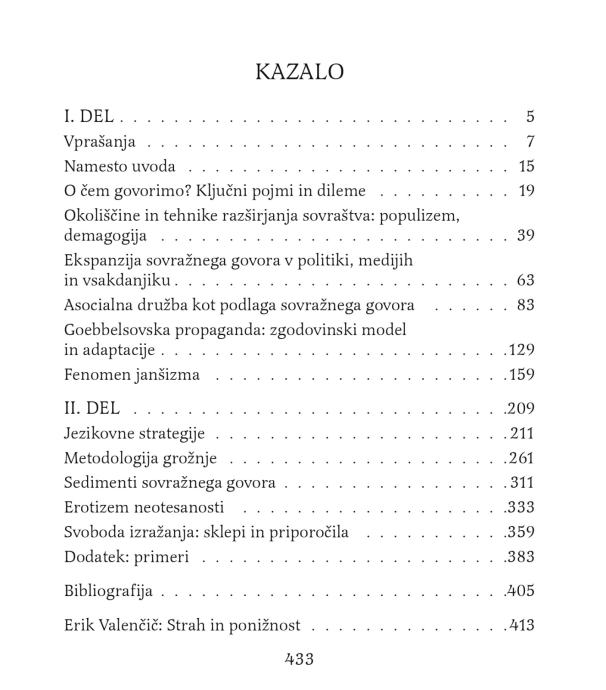 Knjiga je nastajala med letoma 2019 in 2021 in je rezultat spremljanja in analize sovražnega govora v slovenskem medijskem prostoru; premišljuje tudi družbene posledice tega pojava, ki že dosega nevarne razsežnosti. Nevarnost predstavlja načrtno in agresivno netenje, širjenje kolektivne psihoze, pojav pa je primerljiv s podobnimi procesi v mnogih državah Evrope in sveta. Definiranje tega pojava in njegovih različic se začne z opredelitvijo populizma, čeprav ga ne gre enačiti z njim; kljub nekaterim vzporednicam tudi ne z neonacizmom in fašizmom. Obstaja pa generična povezava in metodološko sovpadanje (odnos vzorca in novih kalupov) med goebbelsovsko propagandno in sodobno produkcijo sovražnega govora. Goebbelsov(ski) vzorčni model seveda ni enostavno in univerzalno aplikabilen, skoz raziskavo se namreč pokaže več divergentnih modelov, ki vključujejo drugačne narative, novejši lokalni imaginarij in terminološko arbitrarnost.