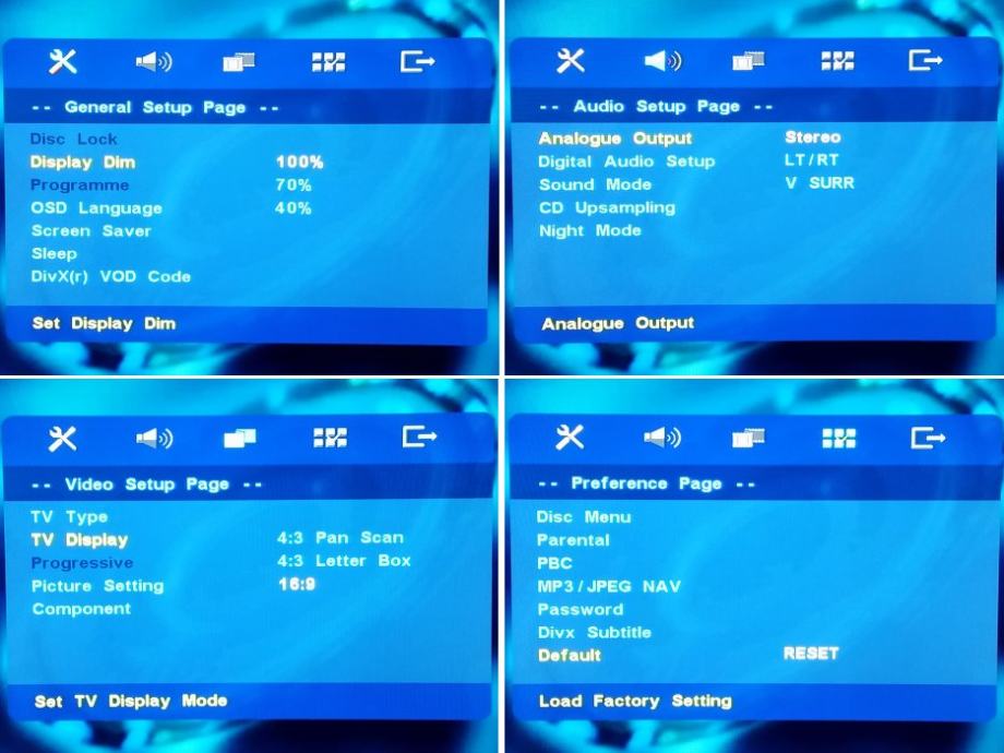 Ima gumbe: PLAY/Pause, STOP, NEXT, PREV in gumb za izmet plošče. Nima gumba MENU za nastavitve (slike menujev sem napravil z uporabo nekega približno ustreznega daljinca).