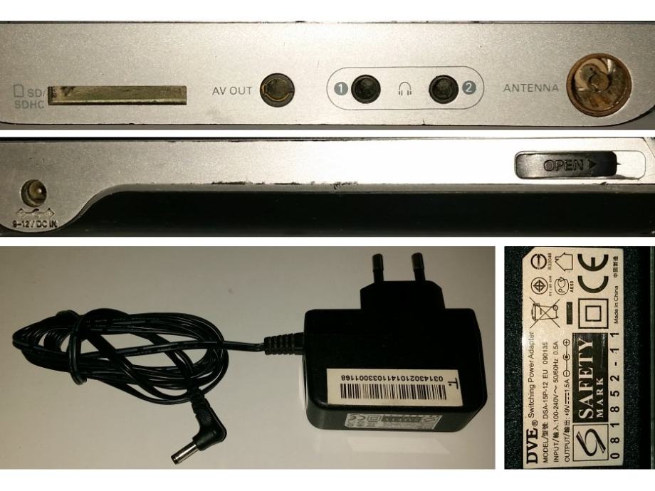 Priložen je napajalnik DVE 9V DC 1.5A, kabel dolžine 1.75 m, s kotnim valjastim konektorjem 4.0/1.5 mm - uporabi se za polnjenje baterije ali pa za neposredno napajanje DVD predvajalnika.
