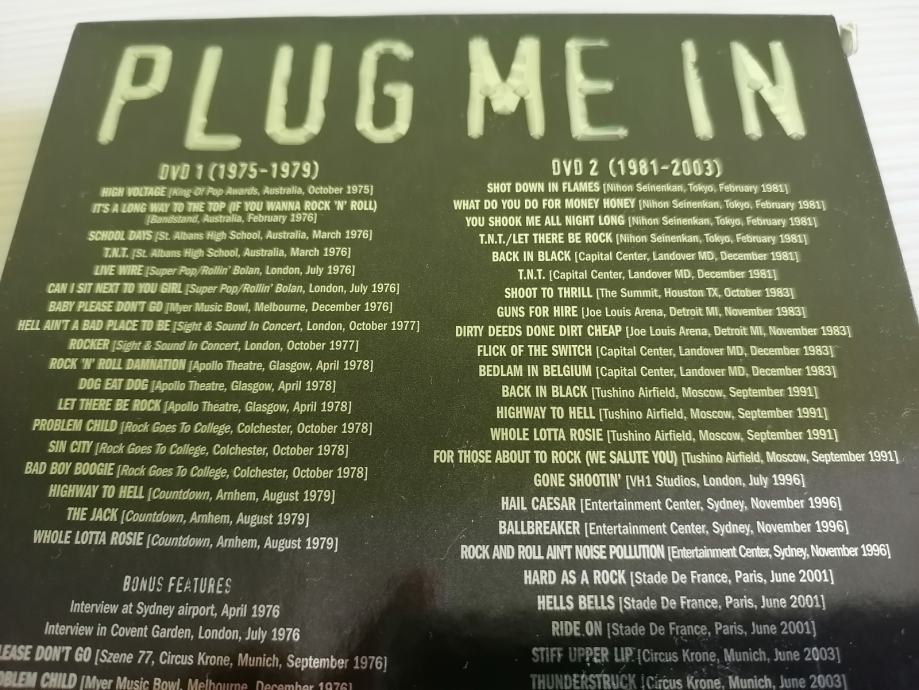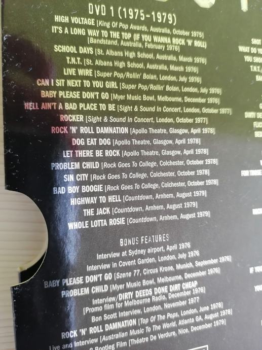 Prodam lepo ohranjen DVD box s krasno zbirko videoposnetkov v živo s celotnim prerezom delovanja avstralske legendarne skupine AC/DC. Na dveh diskih je najprej zajeto obdobje s prvotnim pevcem Bon-om Scott-om in kasneje uspehi z Brian-o Johnson-om.
