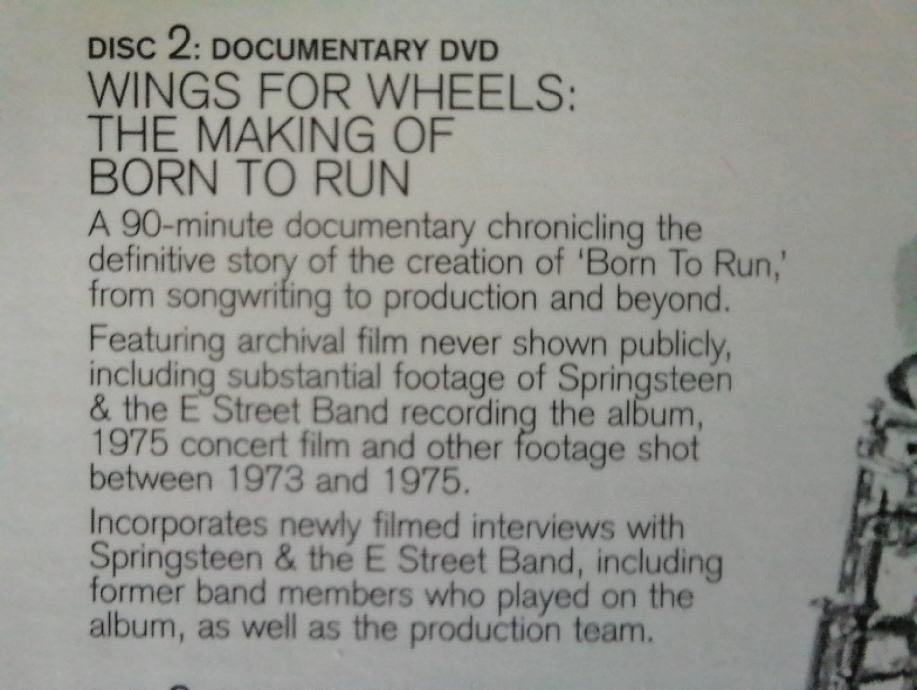 Na dodatnem DVD-ju pa je še 90- minutni dokumentarni film o nastanku albuma Born to Run in številni zanimivi intervjuji s člani takratne zasedbe The E-street band, ki zelo zanimivo opisujejo tisto obdobje in odločilne trenutke ob nastanku posameznih skladb.