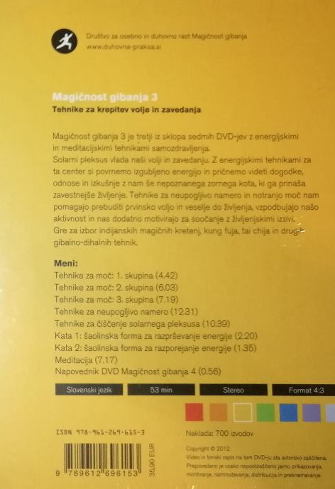 1. Magičnost gibanja 3 - Tehnike za krepitev volje in zavedanja (samozdravljenje, meditacija, solarni pleksus, motivacija, gibalno-dihalne tehnike), knjiga + DVD, 2012