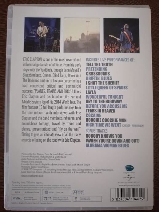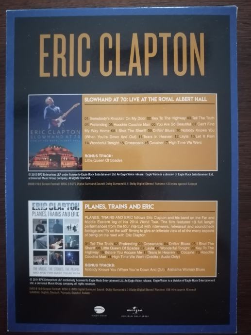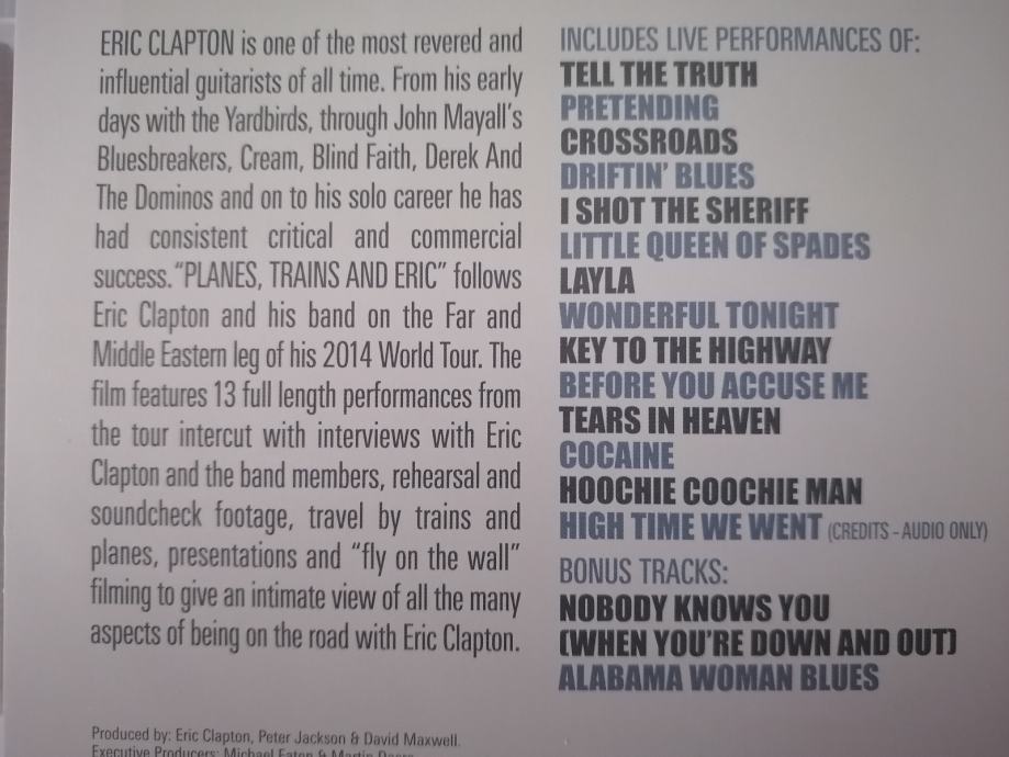 Drugi, 'Planes, Train and Eric' pa je meni osebno še bolj zanimiv. Prikazuje namreč ob koncertnih posnetkih še zelo zanimivo ozadje turnejskega dogajanja po svetu. Kako g. Clapton doživlja nastope, priprave, potovanja in ljudi s katerimi sodeluje po različnih prizoriščih. Hkrati pa ob številnih izjavah spremljevalnih glasbenikov občutimo veličino in spoštovanje do g. Claptona. Izredno zanimiv izdelek!