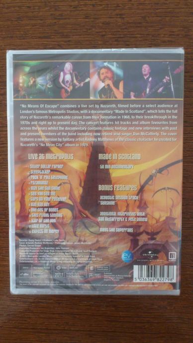 Prodam popolnoma nov, še originalno zapakiran DVD skupine Nazareth. Izdelek je iz leta 2015, na njem je posnetek koncerta iz dvorane Metropolis v Londonu. Dodan pa je še 50 min. dokumentarec o zgodovini skupine z naslovom Made in Scotland, posnetek akustične izvedbe skladbe Sunshine in izdatni intervju s pevcem Dann-om McCafferty-jem in z legendarnim in še edinim ustanovnim članom benda, basistom Pete-om Agnew-om.