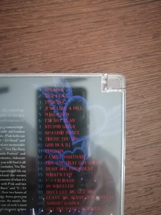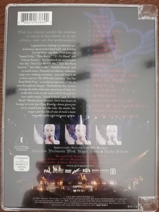 Prodam zelo lepo ohranjen DVD ameriške pevke Pink. Po mojem skromnem mnenju ena njenih najboljših video izdaj očara s perfektnim nastopom, z neverjetno uigrano ekipo na odru in za Pink tako značilnimi akrobatskimi vložki. Da njenega izjemnega petja posebej sploh ne omenjam. Koncert postreže s kar 21-imi skladbami in traja 120 minut! Vrhunska video realizacija, koncert je bil posnet s 15-imi HD kamerami, ton v stereo, DTS in dolby sorround tehniki. Koncert je res prava paša za oči in ušesa. Poleg njega pa še kopica dodatkov: