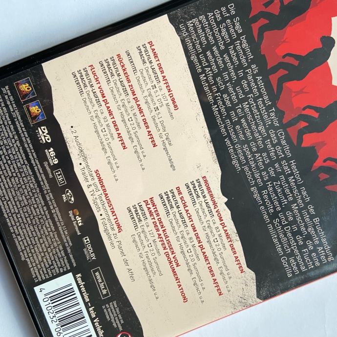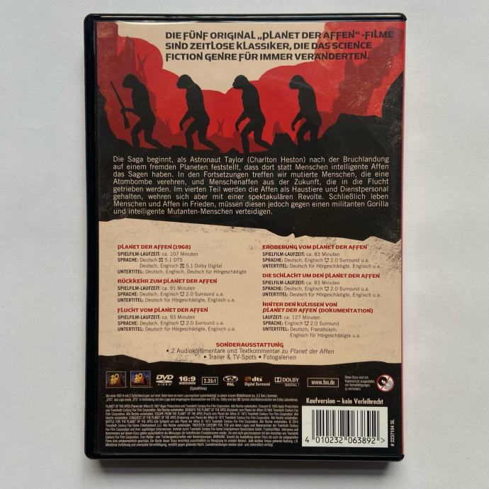6. Behind the Planet of the Apes (bonus disk): Dokumentarec o nastajanju serije in originalni napovedniki za vse filme.