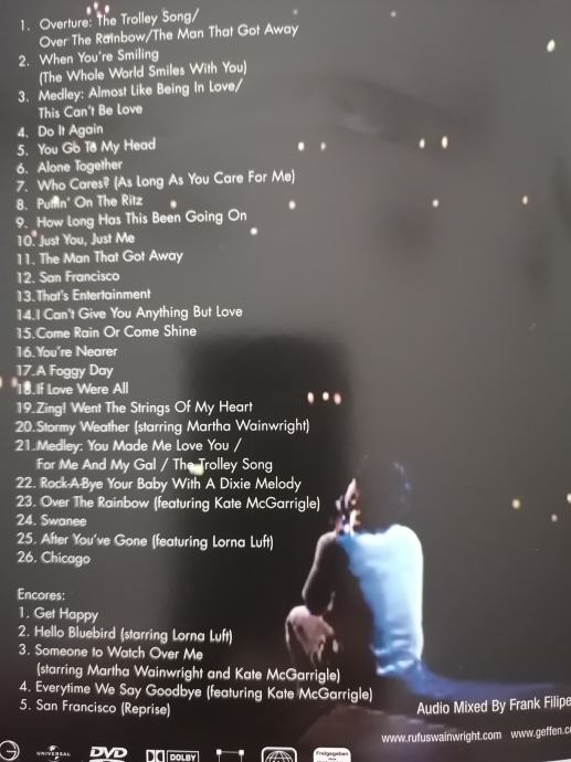 Prodam koncertni DVD Rufus-a Wainwright-a iz londonske dvorane Palladium. Izejmni kanadski glasbenik in zabavljač je v Londonu ponudil opus skladb, ki jih je v izvirnik pela nepozabna filmska in pevska ikona Judy Garland. Glasba se razteza med številnimi žanri in Rufus-a doživeti v živo je res nekaj posbenega.