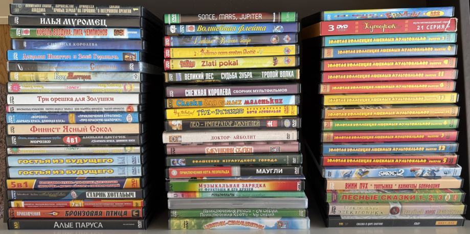 Ugodno prodam 54 otroških filmov in nadaljevank in 171 risank in risanih nadaljevank v ruskem jeziku na DVD-jih, vključno z nekaj najboljšimi sovjetskimi otroškimi klasikami. Vključenih je tudi nekaj otroških DVD-jev v slovenskem jeziku. Celoten seznam je spodaj.