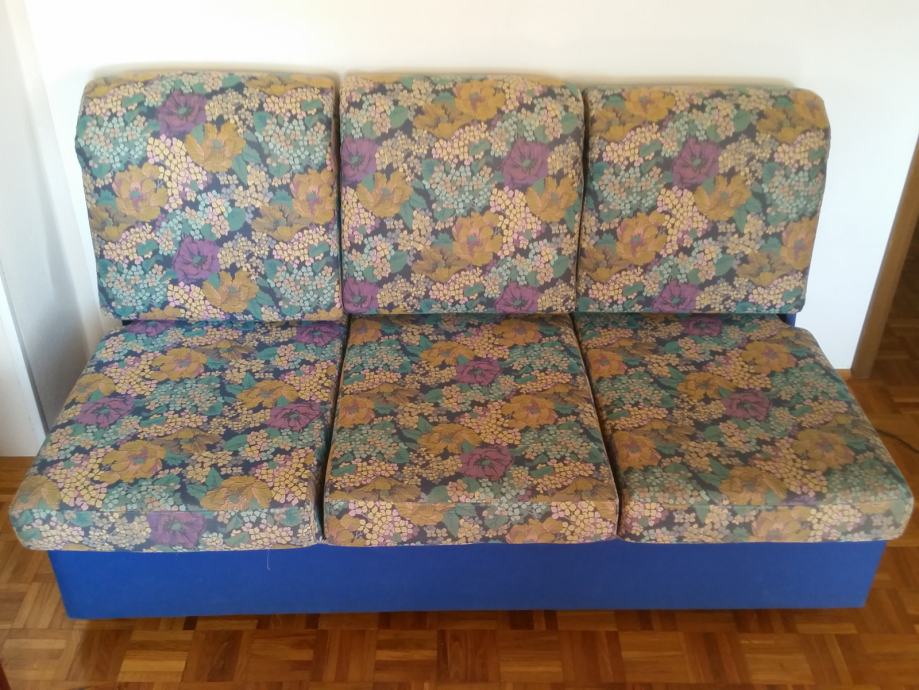 Prodam dvosed s tapiserijo iz blaga, ki ima shranjeno izvlečno ležišče pod sedalnim delom. Širina je 130cm, globina 87cm, višina (pri naslonjalu) pa 82 cm.