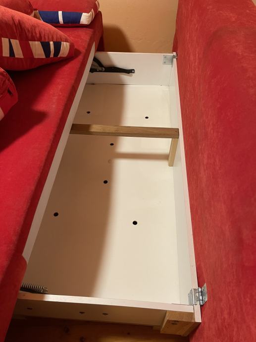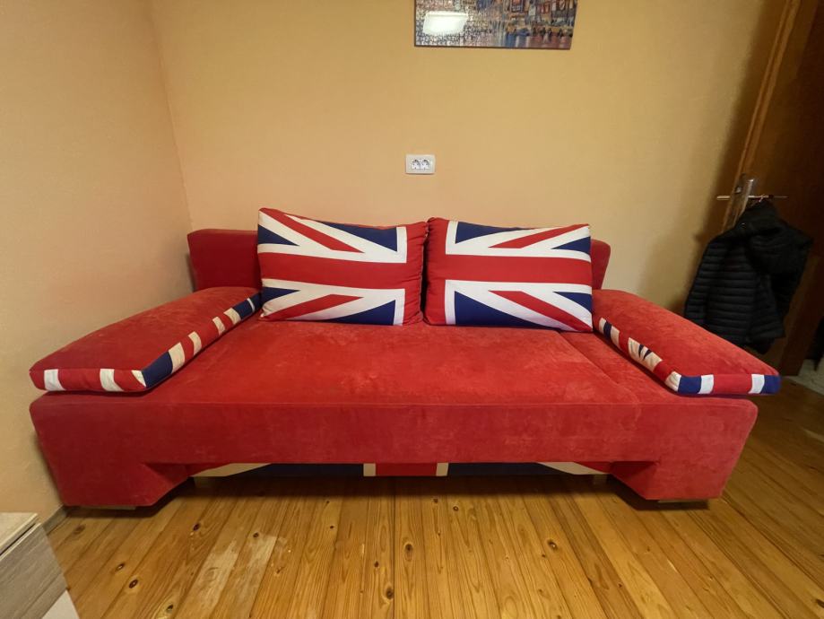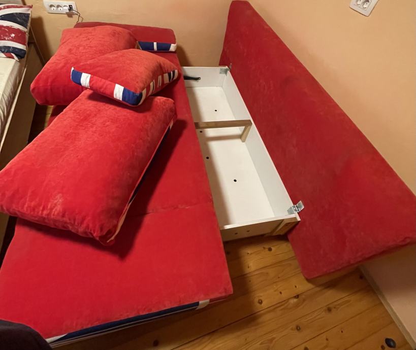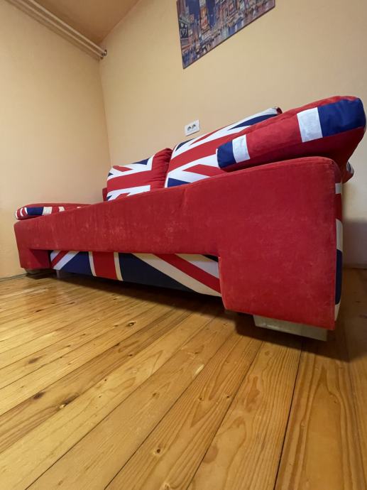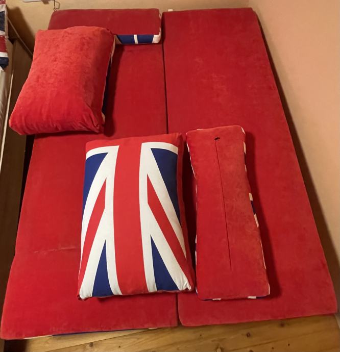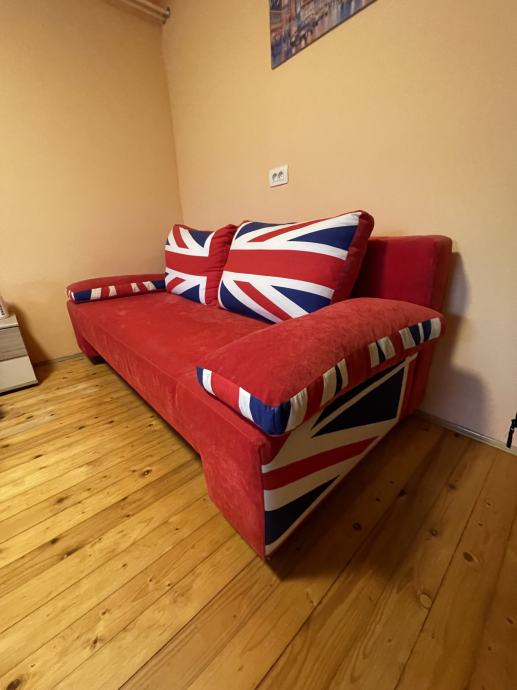 Prodam zelo dobro ohranjen kavč rdeče barve, z britansko zastavo. Vzmeteno bonnel ležišče 140x200cm, spodaj dodatni predal za shranjevanje