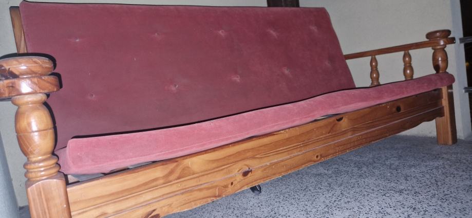 Podarim starejši kavč z lesenim okvirjem in rdečimi blazinami. Kavč je rabljen, a še uporaben in primeren za manjši dnevni prostor. Odličen je za nekoga, ki potrebuje dodatno sedežno površino in ceni klasičen dizajn.