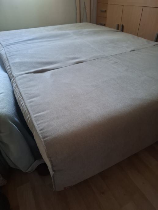 Raztegljiv kavč dvosed s predalom, svetlo sive barve. Brez naslonjal za roke.
