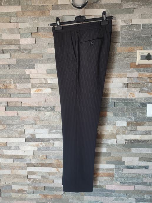 Črne moške fine hlače na črto, kupljene v Italiji. Hlače imajo v blagu svetle bež črtice. Velikost 44, dolžina 103, širina v pasu 40 cm.
