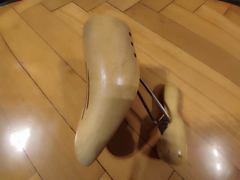 Raztezalec je lesen, s kovinskim menanizmom. Ko se mehanizem zategne, se čevelj daljša.